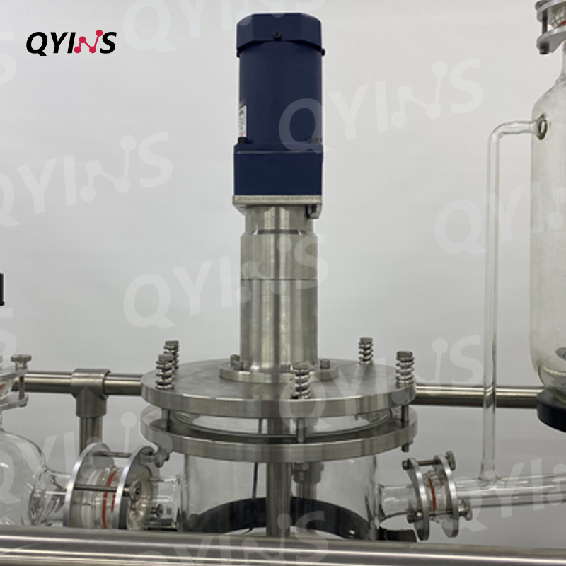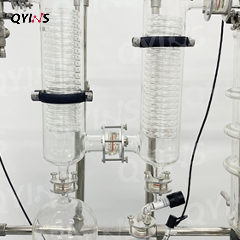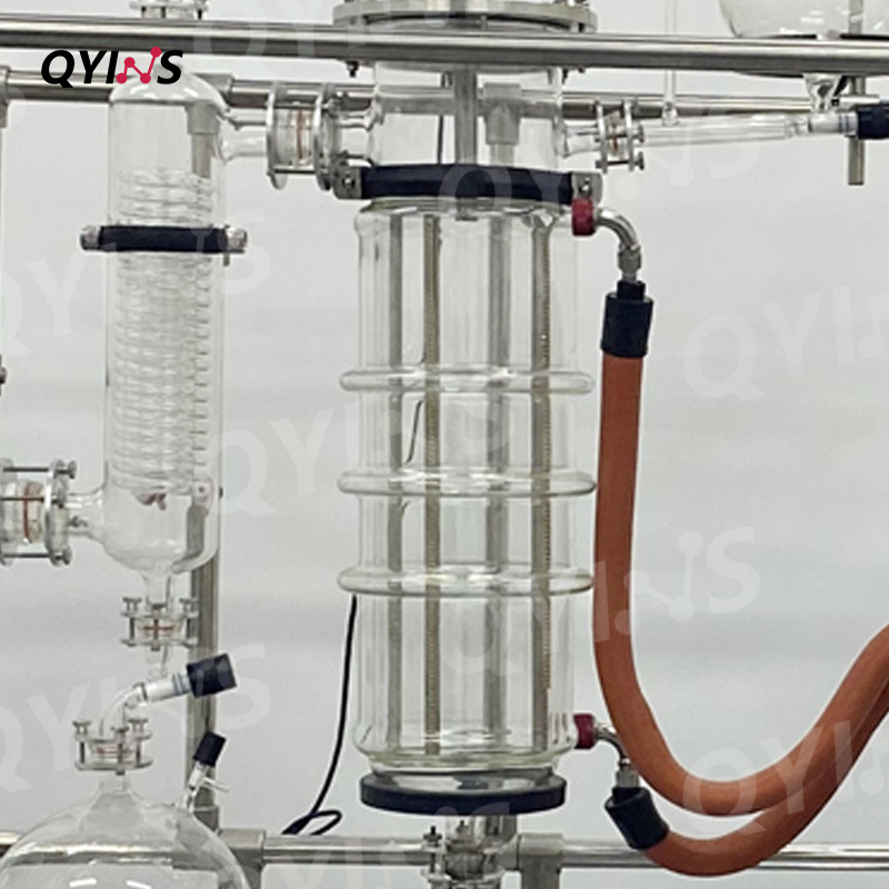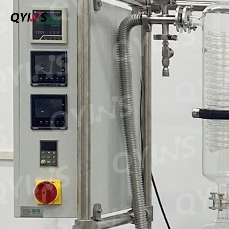 薄膜蒸发器也叫刮膜蒸发器,它与分子蒸馏主要的区别在于减少内置的冷凝器,相较于分子蒸馏,薄膜蒸发器适用于蒸馏或蒸发一些沸点相对较低的热敏性物质的浓缩、蒸馏、分离、脱溶、脱羧、脱臭等。薄膜蒸发器工作原理:物料进入蒸发器后,通过刮板搅动快速成膜热源热量经筒壁与料液进行加热交换,液膜沸腾、气化,进入冷凝器内,凝结成液体排出,浓缩液由底部出料口放出。