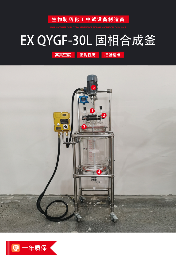 固相合成反应釜,可实现合成裂解固液分离过滤以及结晶等工艺要求,可与常规反应装置轻松组合。使用适当的过滤器分离浆液中的固体颗粒,形成成滤饼;滤液向下流动,从底部出口的阀门流出,过滤板多种材质,多种孔径可选