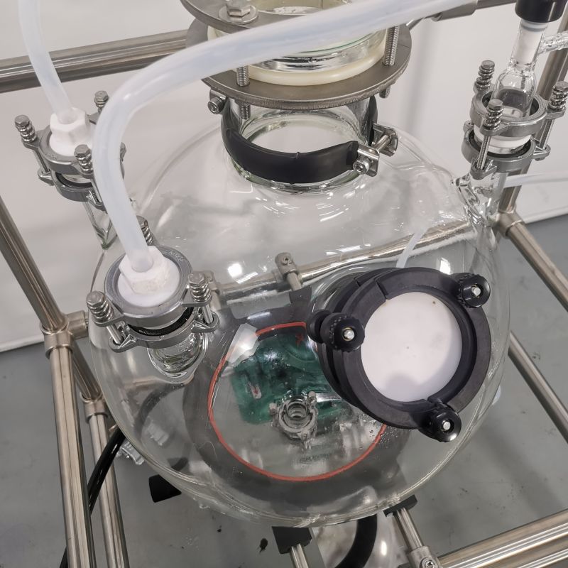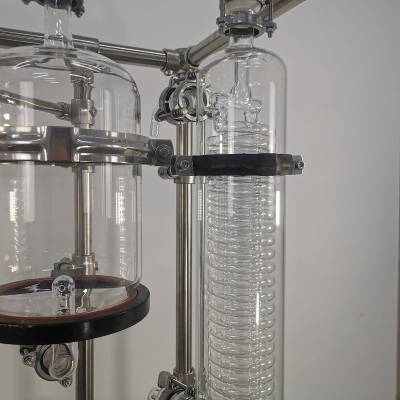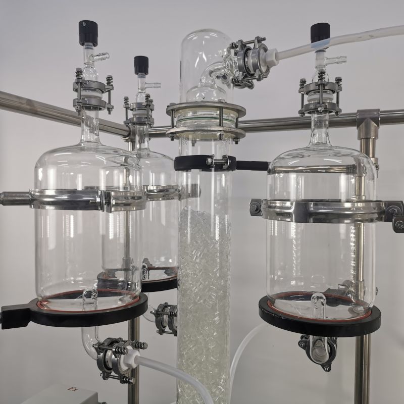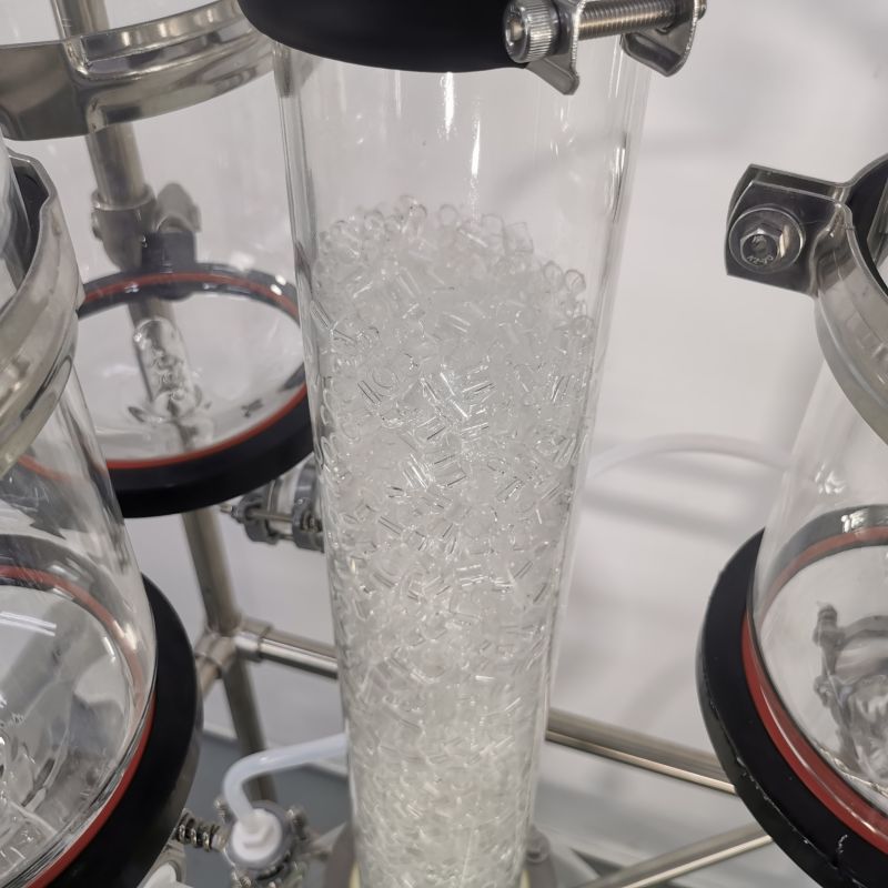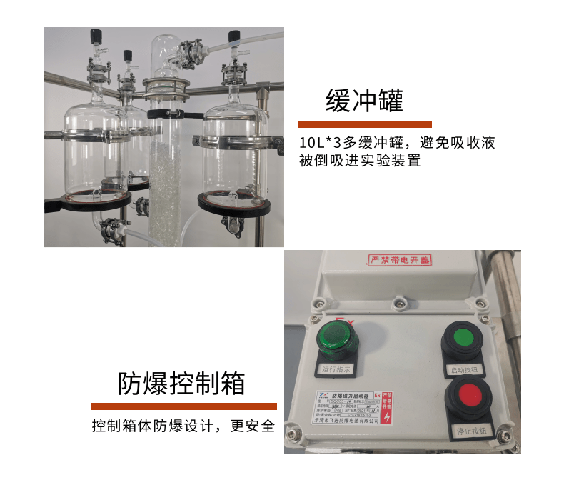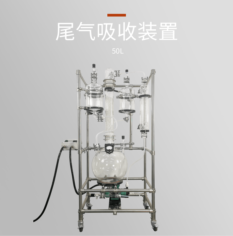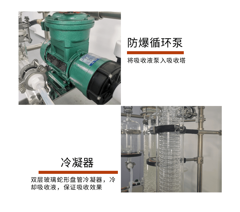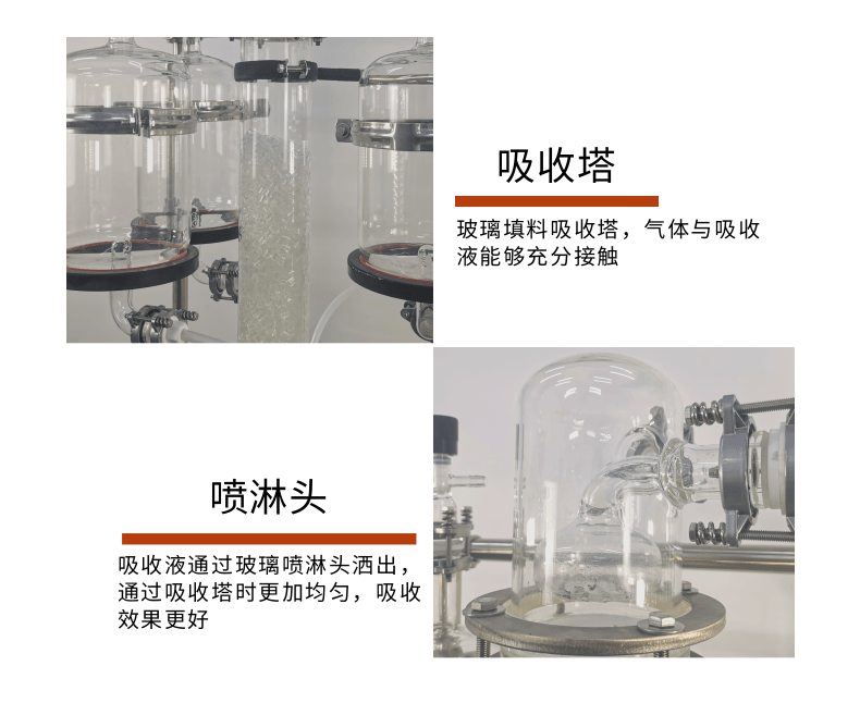 本款防爆尾气吸收,配备三个防倒吸罐。磁力循环泵将吸收液从圆底烧瓶打入喷淋头,从顶部落下。废气反方向进入吸收柱,两者充分接触后,快速达成净化。