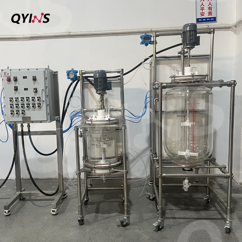 中试多肽合成一条线固相釜(半自动)组合釜,可满足多肽合成、裂解、沉降、活化,全套自动控温。玻璃固相反应釜以304不锈钢管为框架,采用GG17高硼硅双层玻璃釜体,配置PTFE过滤底板。